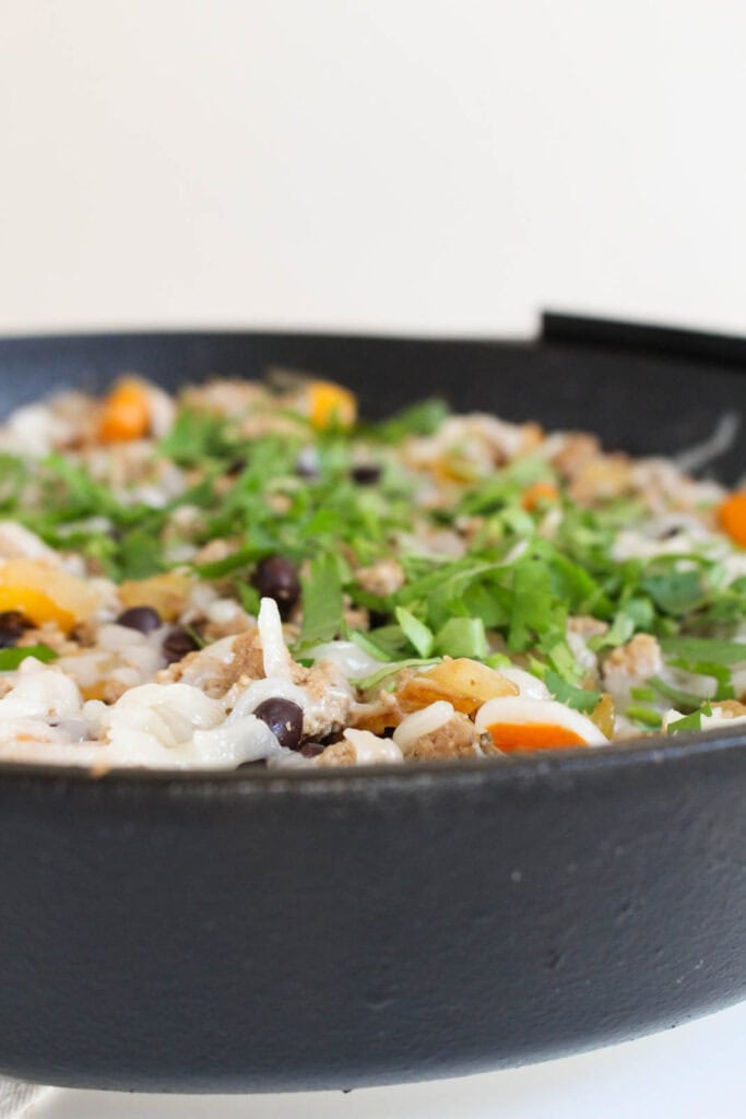 STEP 3 – Add the cooked ground turkey back into the skillet with the onion mixture, as well as the black beans, and stir together to combine. Sprinkle the shredded cheese over the top of the skillet, covering the top evenly. Put a lid on top of the skillet and remove from the heat. Let the cheese melt underneath the lid for 4-5 minutes.